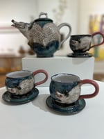 3 cups with saucers and the pot