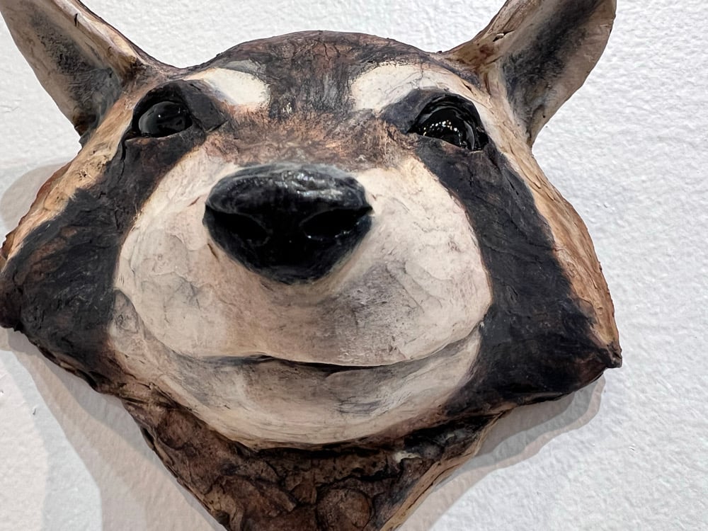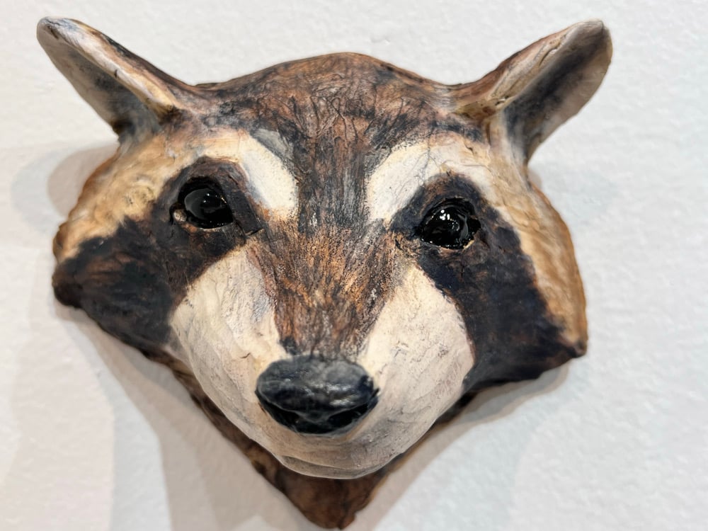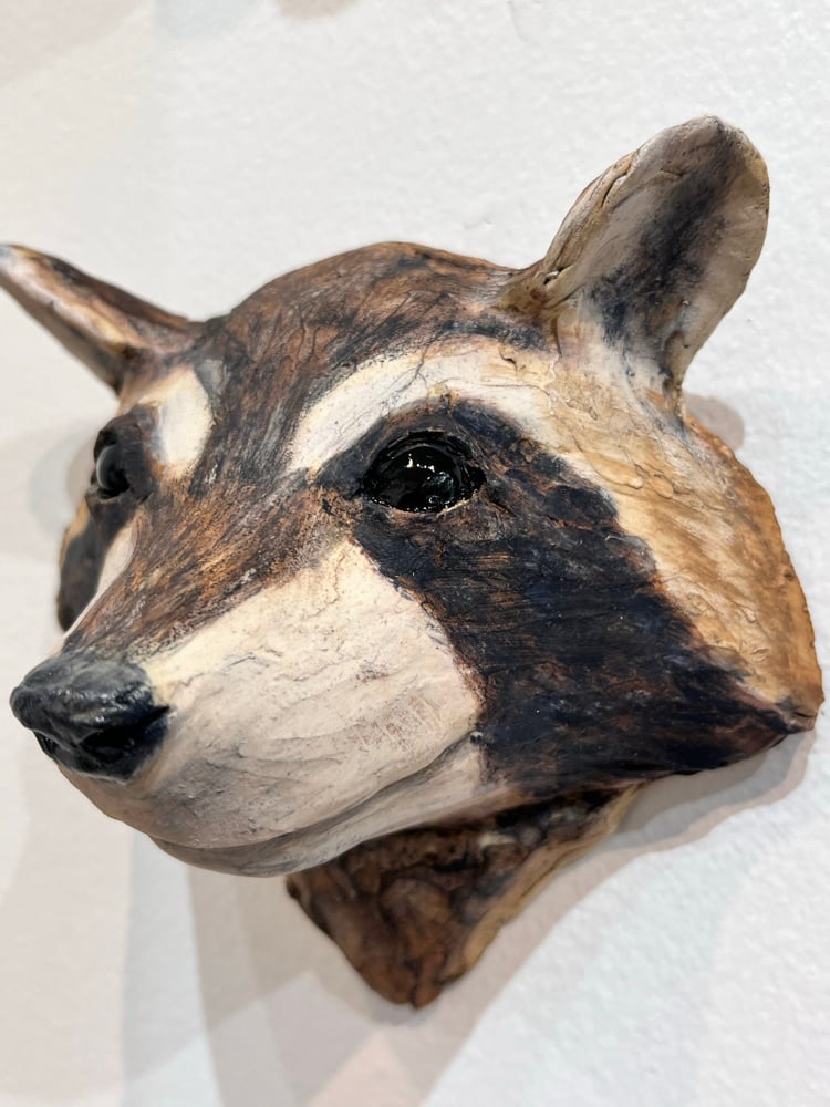 Clay Raccoon sculpture- hangs on wall